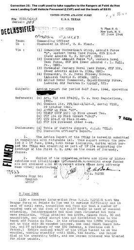 Keywords: LCVP Rangers 7 June 1944.jpg en Texas obtained and dispatched two LCVPs Landing Craft Vehicle Personnel with supplies to Rangers at Point du Hoe and to bring back wounded Rangers and POWs The two craft are not part of BB35 which carried two 26ft wooden whale boats Action Report for period 3 - 17 June 1944 Operation name is blacked out Battleship Texas 1944-06-26 PD-USGov-Military-Navy Documents |