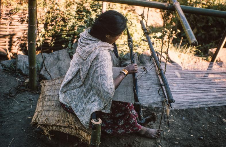 Keywords: handicrafts weaving nepal outdoor Date: 1964-03 Location: Bhojpur Description: Woman weaves local fabric with traditional back-strap loom. This was still fairly common in the northern parts of Bhojpur district, although the practice was declining due to competition from commercial Indian fabrics. Date: 1964-03 Location: Bhojpur Description: Woman weaves local fabric with traditional back-strap loom. This was still fairly common in the northern parts of Bhojpur district, although the practice was declining due to competition from commercial Indian fabrics. |