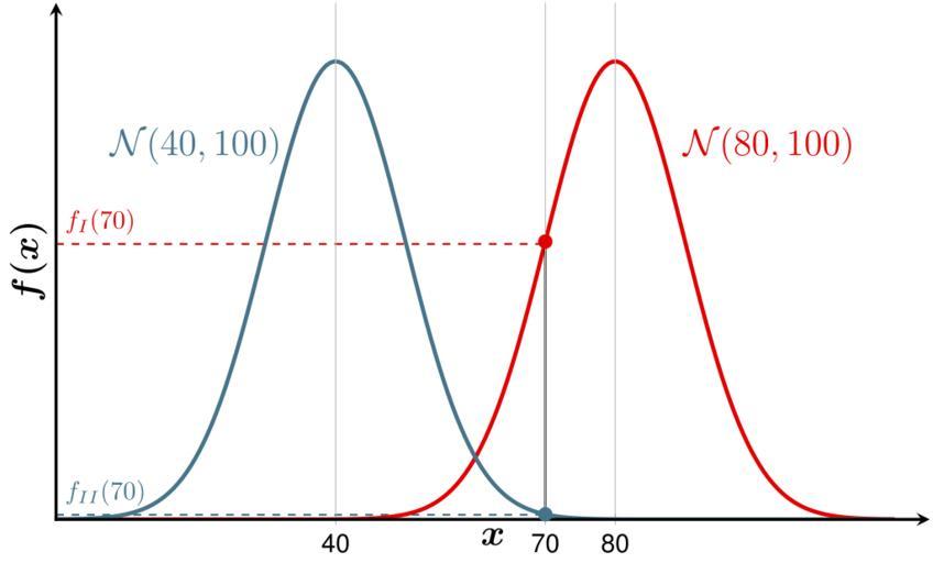 | Keywords: Lda-gauss-1.svg en Normal distribution for a discriminant analysis de Normalverteilung bei einer Diskriminanzalayse e30000 <math>\mathcal N 80 100 </math> 47758c <math>\mathcal N 40 100 </math> own MartinThoma 2014-08-11 cs 0 0 5 anchor south rotate 90 font \boldmath\Large \coordinate plotAcoord at axis cs 70 0 024 ; \coordinate plotAcoordY at axis cs 0 0 024 ; \drawplotA thick dashed plotAcoord - plotAcoordY -- plotAcoord ; \coordinate plotBcoord at axis cs 70 0 0004 ; \coordinate plotBcoordY at axis cs 0 0 0004 ; \drawplotB thick dashed plotBcoord - plotBcoordY -- plotBcoord ; \nodeabove right 0cm and 0cm of plotAcoordY color red 90 black f1y f_ I 70 ; \nodeabove right 0cm and 0cm of plotBcoordY color cyan 50 black f2y f_ II 70 ; Plots of the distributions \addplot domain 0 120 samples 200 plotA gauss 80 100 ; \addplot domain 0 120 samples 200 plotB gauss 40 100 ; Mark points \addplot+plotA samples at 70 mark mark options scale 1 fill red 90 black gauss 80 100 ; \addplot+plotB samples at 70 mark mark options scale 1 fill cyan 50 black gauss 40 100 ; \coordinate a at axis cs 70 0 024 ; \drawblack thick a - current plot begin -- a ; Add labels \nodeplotA above at axis cs 102 0 03 \Large \mathcal N 80 100 ; \nodeplotB above at axis cs 20 0 03 \Large \mathcal N 40 100 ; \addlegendentry \mu 80 \enskip \sigma 2 100 \addlegendentry \mu 40 \enskip \sigma 2 100 \end axis \end tikzpicture \end preview \end document </source> TikZ diagrams Images by Martin Thoma/Mathematics Discriminant analysis Cc-zero |