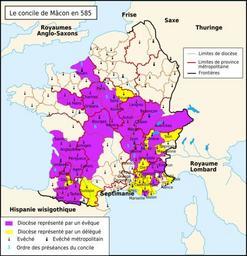 | Keywords: Le concile de Mâcon en 585.svg fr Le concile de Mâcon en 585 Travail personnel sur un fond de carte hydrographique de historicair D'après Michel Rouche Des Wisigoths aux Arabes l'Aquitaine 418-781 naissance d'une région École des Hautes Études en Sciences Sociales Jean Touzot 1979 p 81 et Bruno Dumézil La reine Brunehaut éditions Fayard 2008 p 536 Romain0 2010-02-27 Maps of Gauls Maps of the Frankish territory SVG maps showing history in French | ||||