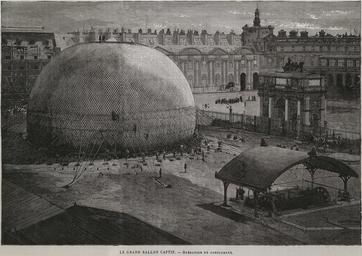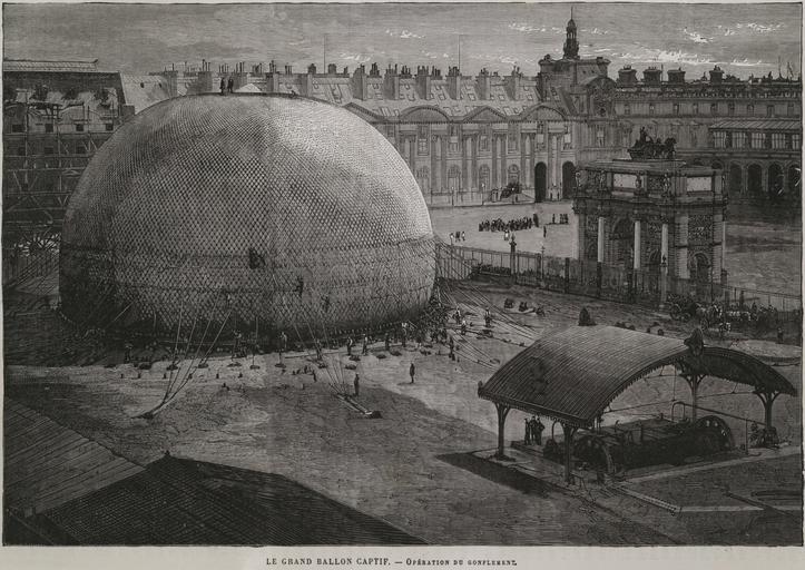 Keywords: Le grand ballon captif. Opération du gonflement.jpg Installation of the hot air balloon at the 1878 Paris World Fair Giffard who was at the origin of the project was a French engineer who created a few models of balloons and who also managed to create navigable ones The 1878 hot air balloon was located in the Tuileries For a fee visitors could enter its gondola and admire the view of the city The balloon could go up to about half a mile 1878 engraving 20 5 x 30 5 cm Institution Brown University Library object history exhibition history credit line Bitard Adolphe L' Exposition de Paris 1878 Rédigée par A Bitard avec la collaboration d'écrivains spéciaux Paris Librairie illustrée; Librairie M Dreyfous 1878 accession number 1254167453195254 PD-old Engravings of Paris Images of Paris from the Brown University Library Grand balloon ascents by Henri Giffard 1878 engravings Historical images of Arc de Triomphe du Carrousel Arc de Triomphe du Carrousel from the west Remote views of Arc de Triomphe du Carrousel