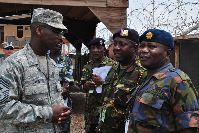 Keywords: Leadership in action, US, Kenyan senior enlisted exchange best practices 120327-N-MM945-293.jpg en Combined Joint Task Force - Horn of Africa Command Senior Enlisted Leader U S Air Force Chief Master Sgt James E Davis Kenya air force base Sgt Maj Maurice Atsango Matwang'a right and Kenya army Weapons Training Sgt Maj David Karisa Barisa discuss a personnel inspection they just completed here March 27 during a visit with Task Force Raptor soldiers from U S Army 3rd Squadron 124th Cavalry Regiment Texas Army National Guard CJTF-HOA hosted the four Kenyan Ministry of Defense senior enlisted leaders to exchange best practices and enhance understanding of the enlisted leadership roles and responsibilities that effect mission execution 2012-03-27 Senior Chief Petty Officer Maria Escamilla https //www dvidshub net/image/552667 120327-N-MM945-293 2012-04-02 03 33 CAMP LEMONNIER DJ PD-USGov-Military-Navy Texas Army National Guard Combined Joint Task Force - Horn of Africa Camp Lemonnier Images from DoD uploaded by Fæ 124th Cavalry Regiment United States |
