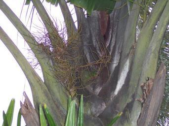 Keywords: Leafsheathsandnewinflorescence.JPG en Triangle-forming leaf sheaths with emergent new inflorescenc Own Mmcknight4 2008-08-31 Dypsis decaryi Leaf sheaths