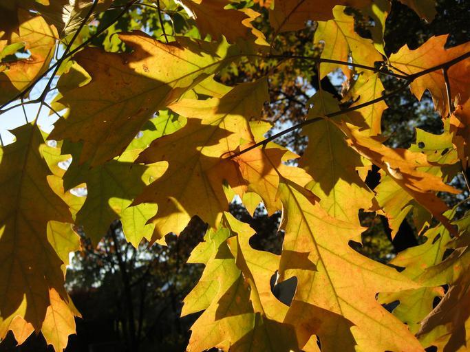 Keywords: leaves autumn emerge orange golden bright translucent oak leaves sunny