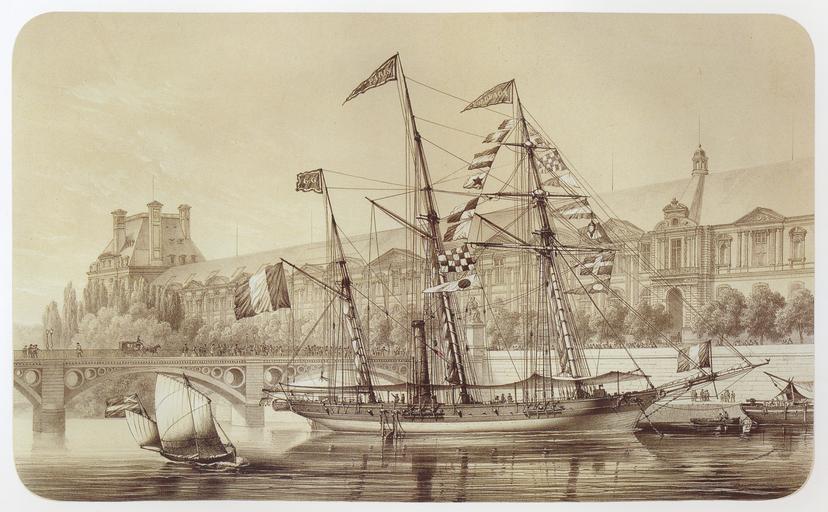 Keywords: Lebreton engraving-02.jpg The Sole first long-range propeler ship anchored in from of the Tuileries in Paris Scanned from Louis Le Breton témoin des marines du XIXème siècle century 19 creator Louis Le Breton PD-old-100 Louis Le Breton