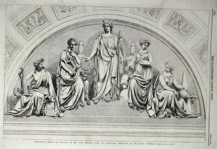 | Keywords: Leeds Town Hall tympanum by John Thomas.jpg Lithograph showing carving of tympanum over main door of Town Hall Leeds West Yorkshire England by John Thomas of London Architect of Town Hall is Cuthbert Brodrick All other architectural carving on building is by Catherine Mawer http //i ebayimg com/images/g/QjIAAOSwImRYGkFJ/s-l1600 jpg Ebay Originally from Illustrated London News September 1858 p 242 Emblematic group of figures by Mr John Thomas over the principal entrance of the Leeds Townhall 1858 unknown Leeds Town Hall archive images PD-old-70-1923 John Thomas sculptor The Illustrated London News Lithographs |