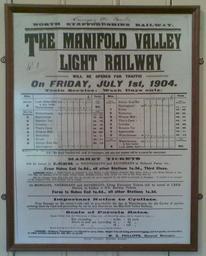Keywords: Leek & Manifold timetable poster.jpg A poster of a Leek Manifold Railway poster displayed in Hulme End station Photo by me released to Public Domain 2007-08-20 own assumed Hogyn Lleol Train timetables in the United Kingdom Leek and Manifold Valley Light Railway |