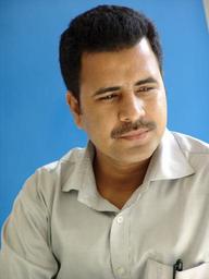 Keywords: left view curved window openings reflecting light late afternoon expansive blue sky man