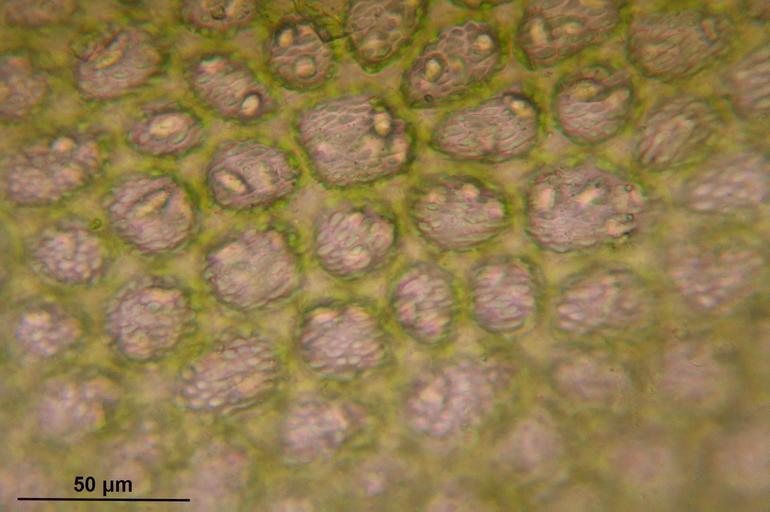 Keywords: Leiocolea collaris (g, 144917-474525) 7623.JPG en Leiocolea collaris de Leiocolea collaris Kleines Glattkelchmoos own HermannSchachner 2012-12-10 Mikroskopaufnahme Flankenblattzellen mit papillöser Kutikula Leiocolea Cc-zero