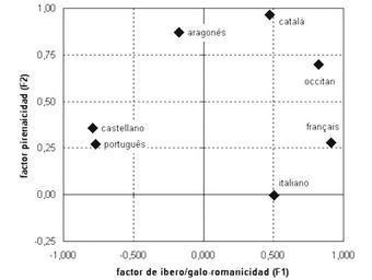 Keywords: LenguasRomances-ACP.png en Principal Component Analysis based on shared vocabulary for some romance languages First factor is related to diferences between ibero-romance and gallo-romance second factor show correlation with Pyrenaic area 2012-02 own Davius cc-zero Romance languages Uploaded with UploadWizard |