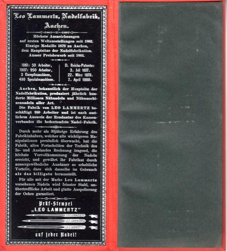 | Keywords: Leo Lammertz Aachen, sewing-needles, sample card (1 b).jpg Nähnadel-Musterkarte der Firma Leo Lammertz Aachen 9 x 20 cm Leinen mit Blind- und mit Goldprägung Leo Lammertz Aachen Eingetr Marke Beste Nadel der Welt Ursprüglich zwei mal fünf Musternadeln enthaltend Runde Hercules-Oerter ohne Angel; Nadelheftchen-Etikett Warenzeichen; Art 284; Runde Hercules Oerter Fabrikat Leo Lammertz 250 Stück No Art 284 Runde Hercules-Oerter; Nadelheftchen-Etikett Warenzeichen; Art 284; Runde Hercules Oerter Fabrikat Leo Lammertz 250 Stück No Art 285 Own possession Erhalten von der Firma Pelz-Orlob Gerda Orlob Düsseldorf 2011-05-16 Kürschner <span class signature-talk >talk</span> 11 00 16 May 2011 UTC PD-old PD-textlogo Kürschner <gallery> File Leo_Lammertz_Aachen _sewing-needles _sample_card_ 1_a jpg File Leo_Lammertz_Aachen _sewing-needles _sample_card_ 1_c jpg </gallery> Sewing machine needles Furrier's collection Kuhn Fur sewing machines Needlemakers Products of Aachen Pelz-Orlob Leo Lammertz |