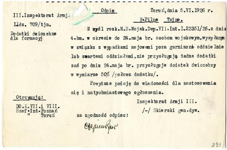 | Keywords: Leonard Skierski - Odpis decyzji o przyznaniu dodatków przez Inspektorat Armii III - 701-001-058-293.jpg Piłsudski Institute document pl Odpis decyzji o przyznaniu dodatków przez Inspektorat Armii III 1926-06-05 pl maszynopis pl Informacja o nieprzyznawaniu dodatku asystencyjnego oddziałom będącym poza garnizonami do 24 maja Po 24 maja przysługuje połowa dodatku ćwiczebnego pl dodatek ćwiczebny; dodatek asystencyjny; przewrót majowy pl Toruń 1926-05-24 <br/> 1926-06-04 701/1/58/293 701 180/2543 2471 Archiwum Józefa Piłsudskiego 1 PD-old-auto-unpublished 1940 yes Collections of Józef Piłsudski Institute of America from 1926 Leonard Skierski Military documents of Second Polish Republic |