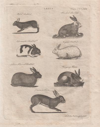 | Keywords: Lepus - Rabbits, Plate CCLXIX, A. Bell.jpg Lepus Wild Rabbit; Hooded Rabbit; Domestic Rabbit; Angora Rabbit; Silver Haired Rabbit; Varying Rabbit; Common Hare A Bell Prin Val Sculptor feat Collection Kuhn unknown Andrew Bell 1726 “1809 Scottish engraver and printer co-founded Encyclopædia Britannica with Colin Macfarquhar PD-old Hares in art Furrier's collection Kuhn Andrew Bell | ||||
