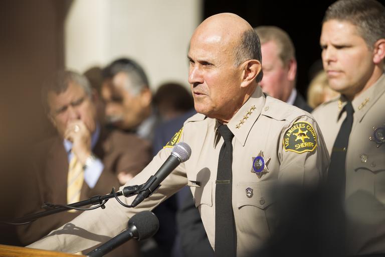 | Keywords: LeroyDavidBaca2.jpg en Los Angeles County Sheriff Leroy David Lee Baca holds a press conference outside LASD headquarters in Montery Park announcing his retirement after serving 15 years as sheriff and 48 years with the department 1/7/2014 own ScottMLiebenson 2014-01-07 https //www flickr com/photos/41802269 N03/11824243263/in/set-72157639526998765 Cc-zero Los Angeles County Sheriff's Department | ||||