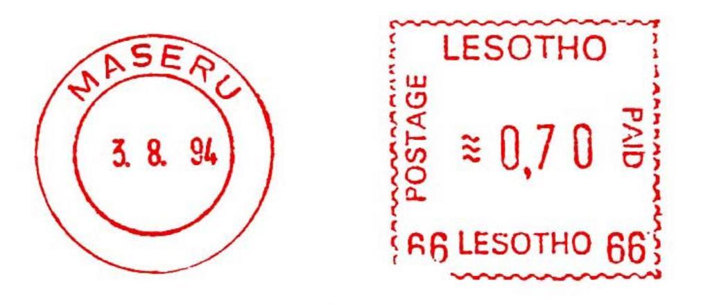 Keywords: Lesotho stamp type BA5B.jpg en Meter stamp catalog image Lesotho type BA5B Richard Stambaugh Richard Stambaugh 2011-11-13 Meter stamps of Lesotho