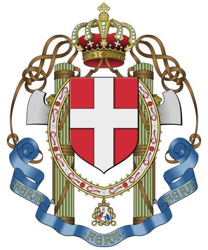 Keywords: Lesser coat of arms of the Kingdom of Italy (1929-1943).svg piccolo stemma del Regno d'Italia durante il fascismo <br/>Lo stemma era impresso anche sulle derive della Regia Aeronautica dal 1930 sino alla fine del regime fascista coat of arms of the Kingdom of Italy during the fascism <br/>The coat of arms was used also on the tail of the Royal Italian Air Force Regia Aeronautica from 1930 until the end of the fascist regime inkscape <div style border 1px solid aaaaaa; padding 5px; font-size 90 ; class box> <center>Regio decreto nº 504<br />11 aprile 1929</center> <center>Articolo 1</center> Il grande stemma dello Stato è formato dello scudo di Savoia di rosso alla croce di argento sormontato da un elmo reale d'oro completamente aperto damascato foderato di rosso e posto in maestà ornato di un cercine e di svolazzi d'oro e di azzurro cimato con la corona di ferro Sostegni due fasci littori addossati con l'ascia all'infuori legati con strisce di cuoio intrecciate e formanti due nodi di Savoia Lo scudo fregiato con la grande collana dell'ordine supremo della SS Annunziata con le grandi fasce delle grandi croci degli ordini reali del SS Maurizio e Lazzaro militare di Savoia e della Corona d'Italia e con nastro e croce del merito civile di Savoia; la grande fascia dell'ordine Mauriziano annodata da quattro cifre reali d'oro e caricata del motto «Fert» tre volte ripetuto Il tutto posto sotto un padiglione di porpora bardato d'un gallone e frangiato d'oro soppannato d'ermellino col colmo di tela di argento ricamato a lingue di guoco d'oro moventi dal lembo superiore e a fiamme alternate d'oro e di rosso nella parte inferiore con un drappellone intagliato a forma di vaii di velluto azzurro gallonato e con fiocchi d'oro; questo padiglione cimato della corona reale <center>Articolo 2</center> Il piccolo stemma dello Stato è formato di uno scudo di rosso alla croce di argento cimato da corona reale dalla quale escono lateralmente due nastri al nodo di Savoia; il tutto accollato al collare dell'ordine della SS Annunziata e sostenuto da due fasci littori con l'ascia all'esterno al naturale Il tutto accompagnato in punta da una lista accartocciata con il motto «Fert» in oro ripetuto tre volte <center>Articolo 3</center> Le varie foggie di questi stemmi sono effigiate nelle tavole unite al presente decreto le quali saranno firmate d'ordine nostro dal capo del governo primo Ministro segretario di Stato La corona reale è quella prescitta dagli artt 43 e 45 del regio decreto 1º gennaio 1890 sopra i titoli e stemmi della famiglia reale </div> http //www giacomocaruso it/mc202/immagine 20087 jpg immagine 20087 jpg http //www hist uib no/antikk/redigerte-stamp/r244 jpg A stamp http //www hi is/~maurizio/trasvolata/savoia gif A picture Massimo Civoli Aeroplani 1923 - 2003 Gribaudo editore ISBN 88-8058-299-2 a cura di Roberto Gervaso parlami d'amore Mariù Vita costume e storia d'Italia tra gli anni venti e quaranta Rizzoli A photo taken at Vigna di Valle Museum a museum of the Italian Air Force http //www aereomodellistiagello it/images/agello/stemma jpg 2007-07-13 F l a n k e r F l a n k e r SVG coats of arms of Italy Military symbols of Italian fascism Military coats of arms of the Italian Air Force Cords in heraldry Knots in heraldry Coats of arms of Kingdom of Italy Roundels of Italy Order of the Most Holy Annunciation in heraldry Fasces in supporters Crowns in crest Gules a cross argent FERT |