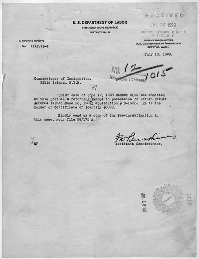 | Keywords: Letter from the Assistant Commissioner of the Seattle District Office of the Immigration Service requesting a copy of... - NARA - 278623.tif Scope and content This document is filed with the Chinese Exclusion Act case file involving Warren Wong General notes 278623 Local identifier Department of Justice Immigration and Naturalization Service Northeast Region INS District No 3 New York NY 06/14/1940 - Most Recent <br /> Department of the Treasury Office of the Secretary of the Treasury 09/02/1789 - Predecessor NARA's Northeast Region New York City NRAAN 201 Varick Street New York NY 10014-4811 1929-07-10 Record group Record Group 85 Records of the Immigration and Naturalization Service 1787 - 2004 Record group ARC 414 Chinese Exclusion Act Case Files compiled ca 1882 - ca 1960 Series ARC 584668 File unit Chinese Exclusion Act case file for Warren Wong 06/28/1895 - 04/16/1936 File unit ARC 278618 Variant control numbers NAIL Control Number NRAN-85-CHINEXCL-12 1015 -5 yes Other versions NARA-cooperation PD-USGov Chinese Exclusion Act |