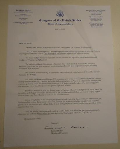 | Keywords: Letter from congressperson Leonard Lance to me using franking privilege.jpg franking privilege which means they can send free letters to constituents without having to pay for postage The initial idea was to enable communication between legislators and the public; today it is essentially free advertising unavailable to challengers Staffers for my congressperson Leonard Lance found my name on a database of citizens interested in tax reform and as a result I got this form letter I do not vote for Republicans or Democrats any longer This letter is a publication of the United States government 2012-08-16 own Tomwsulcer cc-zero Uploaded with UploadWizard 2012 in New Jersey 2012 texts Letters written messages Leonard Lance |