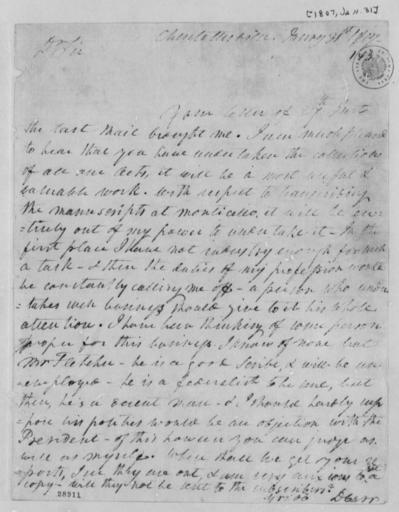 | Keywords: Letter from Dabney Carr to William Waller Hening 1807.jpg en Letter from Dabney Carr to Walter Waller Henning Virginia legal writer and author of Hening's Statutes at Large The Thomas Jefferson Papers Series I General Correspondence The Library of Congress Washington D C http //memory loc gov/cgi-bin/query/P mtj 1 /temp/~ammem_f1xF mdb mcc gottscho detr nfor wpa aap cwar bbpix cowellbib calbkbib consrvbib bdsbib dag fsaall gmd pan vv presp varstg suffrg nawbib horyd wtc toddbib mgw ncr ngp musdibib hlaw papr lhbumbib rbpebib lbcoll alad hh aaodyssey magbell bbc dcm raelbib runyon dukesm lomaxbib mtj gottlieb aep qlt coolbib fpnas aasm denn relpet amss aaeo mff afc911bib mjm mnwp rbcmillerbib molden ww2map mfdipbib afcnyebib klpmap hawp omhbib rbaapcbib mal ncpsbib ncpm lhbprbib ftvbib afcreed aipn cwband flwpabib wpapos cmns psbib pin coplandbib cola tccc curt mharendt lhbcbbib eaa haybib mesnbib fine cwnyhs svybib mmorse afcwwgbib mymhiwebib uncall afcwip mtaft manz llstbib fawbib berl fmuever cdn upboverbib mussm cic afcpearl awh awhbib sgp wright lhbtnbib afcesnbib hurstonbib mreynoldsbib spaldingbib sgproto scsmbib afccalbib Library of Congress http //memory loc gov/master/mss/mtj/mtj1/037/0700/0708 jpg Dabney Carr 1807-01-31 PD-old-100 Manuscript letters written messages |