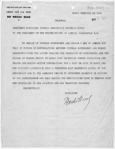 Keywords: Letter from Ho Chi Minh to President Harry S. Truman - NARA - 305263.tif Scope and content General notes 305263 Local identifier Joint Chiefs of Staff Office of Strategic Services 06/13/1942 - 10/01/1945 NARA-Place Vietnam Asia nation 3137431 16 106 <br /> Archives II Reference Section Military Textual Archives Services Division NWCT2RM National Archives at College Park 8601 Adelphi Road College Park MD 20740-6001 1946-02-28 Record group Record Group 226 Records of the Office of Strategic Services 1919 - 2002 Record group ARC 553 Washington and Pacific Coast Field Station Files compiled 1942 - 1945 Series ARC 305262 File unit File unit ARC Variant control numbers NAIL Control Number NWCTM-226-ENT140-HOCHIMINHLTR<br /> Other Identifier 10426<br /> This is the NARA internal exhibit tracking number yes Other versions <gallery> File Letter_from_Ho_Chi_Minh_to_President_Harry_S _Truman_-_NARA_-_305263 tif tif File Letter_from_Ho_Chi_Minh_to_President_Harry_S _Truman_-_NARA_-_305263 jpg jpg </gallery> NARA-cooperation PD-USGov Ho Chi Minh documents Harry S Truman documents Vietnam in the 1940s |