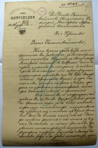 | Keywords: Letter from Synesius of Skopje to Dimitar in Kratovo about Kozma from Mount Athos 30 August 1895.jpg Синесий Скопски до а хие ейския наместник в К атово поп Димитъ относно Козма от Света го а който ще бъде назначен за игумен на Лесновския манасти 30 август 1895 г en A Letter from Synesius of Skopje to Dimitar the diocese representative in Kratovo about Kozma from Mount Athos who is about to be appointed as abbot of Lesnovo Monastery 30 August 1895 mk Писмо од скопскиот мит ополит до а хие ејскиот намесник во К атово за назначување на Козма за игумен на Лесновскиот манасти 1895-08-30 Д жавен а хив на Република акедонија Synesius of Skopje PD-old other versions DARM file Supported by Shared Knowledge cc-by-sa-3 0 Uploaded with UploadWizard Lesnovo Monastery Diocese of Skopje Kozma of Lesnovo Letters of Bulgaria Synesius of Skopje Kratovo |