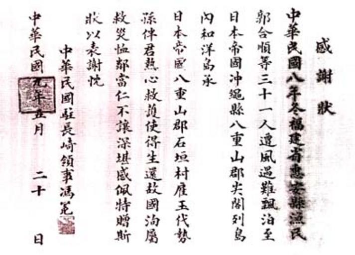 Keywords: Letter of thanks from ROC consul to Ishigakijima in 1920.jpg Letter of thanks from Republic of China consul resident in Nagasaki to Ishigakijima in 1920 In this letter the consul of ROC thanked for saving Fujian fishermen who met with a disaster then were cast ashore in Senkaku Islands And he recognized that Senkaku Islands were the territories of Japan Provisional translation by Ministry of Foreign Affairs of Japan In the winter of the 8th year 1919 of the Republic of China 31 fishermen from Hui'an Country Fujian Province were lost due to the stormy wind and were washed ashore on the Wayo Island of the Senkaku Islands Yaeyama District Okinawa Prefecture Empire of Japan Thanks to the enthusiastic rescue work by the people of Ishigaki village Yaeyama District Empire of Japan they were able to safely return to their homeland With a deep response and admiration toward the people of the village who were willing and generous in the rescue operation I express my gratitude by this letter Consul of the Republic of China in Nagasaki Feng Mien 20 May the 9th year 1920 of the Republic of China 尖閣諸島に漂 した福建 漁民を救助したことに対して 中華民国駐長崎領事・馮冕から石垣島島民に贈られた感 状 http //www geocities jp/tanaka_kunitaka/senkaku/testimonial1920 jpg<br> See alternate source http //ryukyushimpo jp/news/storyid-3159-storytopic-1 html 尖閣は日 の領 遭難救助の中国政 感 状に明記 'Senkaku is Japanese territory ' stated a letter of thanks distress and safety of the Chinese government Ryukyu Shimpo June 15 2005 9th year of Minguo calendar 1920 May 20 中華民国9年(1920年)5 20日 中華民国駐長崎領事・馮冕 Documents of Senkaku Islands Diplomacy Letters of China Certificates of appreciations PD-China PD-Japan |