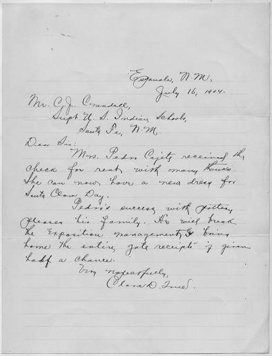 Keywords: Letter to Superintendent concerning rent moner for Pedro Cajete. - NARA - 293299.tif Scope and content Letter to Supt Crandall from Miss True thanking him for the rent money which Mrs Pedro Cajete will use for a new dress She announced that Pedro Cajete was very successful with his pottery at the St Louis Exposition General notes 293299 Local identifier Department of the Interior Bureau of Indian Affairs Santa Fe Indian School Santa Clara Day School - NARA-Author True Clara D Author 8467825 <br /> New Mexico United States North and Central America state 4191641 35 -105 <br /> NARA's Rocky Mountain Region Denver NRGA Building 48 Denver Federal Center West 6th Avenue and Kipling Street Denver CO 80225-0307 1904-07-16 Record group Record Group 75 Records of the Bureau of Indian Affairs 1793 - 1999 Record group ARC 404 Letters Received from Day School Teacher Clara D True compiled 08/29/1902 - 09/17/1906 Series ARC 293139 File unit File unit ARC Variant control numbers NAIL Control Number NRG-75-E38-E19040716B yes Other versions NARA-cooperation PD-USGov United States Department of the Interior