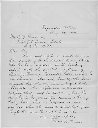 Keywords: Letter to Superintendent concerning enrollment of students - NARA - 293300.tif Scope and content Letter to Supt Crandall from Mrs True stating that she would not admit any child who had been previously enrolled in a boarding school General notes 293300 Local identifier Department of the Interior Bureau of Indian Affairs Santa Fe Indian School Santa Clara Day School - NARA-Author True Clara D Author 8467825 <br /> New Mexico United States North and Central America state 4191641 35 -105 <br /> NARA's Rocky Mountain Region Denver NRGA Building 48 Denver Federal Center West 6th Avenue and Kipling Street Denver CO 80225-0307 1904-08-29 Record group Record Group 75 Records of the Bureau of Indian Affairs 1793 - 1999 Record group ARC 404 Letters Received from Day School Teacher Clara D True compiled 08/29/1902 - 09/17/1906 Series ARC 293139 File unit File unit ARC Variant control numbers NAIL Control Number NRG-75-E38-E19040829 yes Other versions NARA-cooperation PD-USGov Boarding schools in New Mexico Department of the Interior Office of Indian Affairs Native American schools |