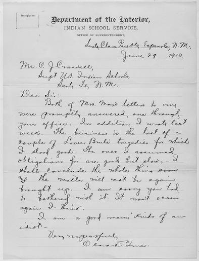 Keywords: Letter to Superintendent regarding the letters sent by Mrs. May concerning a debt. - NARA - 293213.tif Scope and content Letter to Supt Crandall from Miss True stating she had responded to Mrs May's letters promptly Miss True said she had accepted responsibility of a debt at Lower Boule and she would take care of it as soon as possible General notes 293213 Local identifier Department of the Interior Bureau of Indian Affairs Santa Fe Indian School Santa Clara Day School - NARA-Author True Clara D Author 8467825 <br /> New Mexico United States North and Central America state 4191641 35 -105 <br /> NARA's Rocky Mountain Region Denver NRGA Building 48 Denver Federal Center West 6th Avenue and Kipling Street Denver CO 80225-0307 1903-06-29 Record group Record Group 75 Records of the Bureau of Indian Affairs 1793 - 1999 Record group ARC 404 Letters Received from Day School Teacher Clara D True compiled 08/29/1902 - 09/17/1906 Series ARC 293139 File unit File unit ARC Variant control numbers NAIL Control Number NRG-75-E38-B19030629 yes Other versions NARA-cooperation PD-USGov United States Department of the Interior