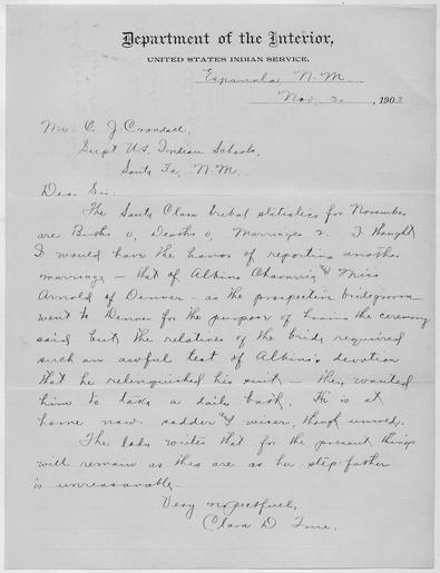 Keywords: Letter to Superintendent reporting the statistics for the month of November. - NARA - 293246.tif Scope and content Letter to Supt Crandall from Miss True reporting the statistics for the Santa Clara Pueblo for the month of November She stated that there were 2 marriages and there would have been another one but the relatives of the bride who lived in Denver demanded that the prospective bridegroom from the Pueblo bathe daily The Indian relinquished his suit because he thought that was unreasonable General notes 293246 Local identifier Department of the Interior Bureau of Indian Affairs Santa Fe Indian School Santa Clara Day School - NARA-Author True Clara D Author 8467825 <br /> New Mexico United States North and Central America state 4191641 35 -105 <br /> NARA's Rocky Mountain Region Denver NRGA Building 48 Denver Federal Center West 6th Avenue and Kipling Street Denver CO 80225-0307 1903-11-30 Record group Record Group 75 Records of the Bureau of Indian Affairs 1793 - 1999 Record group ARC 404 Letters Received from Day School Teacher Clara D True compiled 08/29/1902 - 09/17/1906 Series ARC 293139 File unit File unit ARC Variant control numbers NAIL Control Number NRG-75-E38-C19031130B yes Other versions NARA-cooperation PD-USGov United States Department of the Interior |