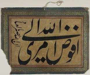 Keywords: Levha, or Calligraphic Panel WDL6834.png Artwork ru Левха или Каллиг афическая панель fr Levha ou panneau de calligraphie en Levha or Calligraphic Panel zh 书法字幅 pt Levha ou painel de caligrafia ar لوحة ru Данная каллиг афическая панель соде жит высказывание на а абском языке написанное в стиле насталик че ными че нилами на ко ичневом фоне ук ашенном амкой синего и озового цветов с золотым о наментом ижние углы панели с обеих сто он ут ачены В тексте гово ится Я вве яю свои дела Аллаху Воистину Аллах заботится о своих слугах Эта молитва возлагающая всю надежду на Аллаха обычно читается ве ующими в качестве <em> дуа </em> благочестивой мольбы к Господу П едставители яда мистических г упп таких как суфийский о ден акшбанди также многок атно читают эту дуа во в емя молитвы салат аль-фадж п ед ассветная молитва Судя по остаткам ве евки п ик епленной к ве хней части данной панели она могла висеть на стене в жилище де виша п иблизительно в XVIII XIX веках <br>А абская каллиг афия; А абские укописи; Иллюмини ование укописей; Исламская каллиг афия; Исламские укописи; Письмо насталик fr Ce panneau de calligraphie comprend un dicton arabe en écriture nastaliq noire sur fond marron Il est encadré de bordures bleues et roses décorées de motifs dorés Les coins inférieurs droit et gauche ont été perdus Le dicton indique « Je confie mes affaires à Dieu Vraiment Dieu s'occupe de ses serviteurs » Cette prière particulière qui place une confiance totale en Dieu est généralement récitée par une personne comme une <em>doua</em> invocation pieuse au Seigneur Plusieurs groupes mystiques tels que la confrérie soufie des naqshbandiyya récitent aussi cette doua de façon répétée durant la salat al-fajr prière de l'aube à en juger par les ficelles restées attachées à la partie supérieure de ce panneau de calligraphie il a probablement été suspendu à un mur dans une hutte de derviche durant les XVIII<sup>e</sup>-XIX<sup>e</sup> siècles <br>Calligraphie arabe; Manuscrits arabes; Enluminures; Calligraphie islamique; Manuscrits islamiques; Écriture nastaliq en This calligraphic panel includes an Arabic saying written in black Nasta'liq script on a brown background framed in blue and pink borders decorated with gold designs The lower right and left corners of the panel are lost The saying reads I entrust my affairs to God Truly God looks after His servants This particular prayer which places complete trust in God typically is recited by an individual as a <em>du'a</em> pious invocation to the Lord Several mystical groups such as the Naqshbandi order of Sufis also recite this du'a in a repeated fashion during the Salat al-fajr prayer performed at daybreak Judging from the remaining strings attached at the top of this calligraphic panel it probably had been suspended from a wall in a dervish lodge sometime during the 18th 19th centuries <br>Arabic calligraphy; Arabic manuscripts; Illuminations; Islamic calligraphy; Islamic manuscripts; Nasta'liq script zh 此书法字幅上 以黑色波斯体 褐色背景上书写的阿拉伯祈祷词,背景上裱 以金色图案装饰的 色和粉红色边框 字幅的右下角和左下角都遗失了 祈祷词写道: 我把我的事情委托 主, 主确是照顾众仆的 这种特殊的祈祷词,给予 主完全的信任, 常是由个人背诵 为献给 主的<em>虔诚祷告</em> 几个神秘的群体,如苏菲派的纳格 班底教团, 晨礼(黎明时进行的祈祷)时也会以重复的方式吟诵这 虔诚祷告 从此书法字幅顶部的遗留绳串 ,它可能 18-19 世纪的某个时间曾被悬挂 苦行僧寄宿 的墙上 <br>阿拉伯文书法; 阿拉伯语手稿; 插图; 伊斯兰书法; 伊斯兰手稿; 波斯体书法 pt Este painel de caligrafia inclui um ditado árabe escrito em caligrafia nasta'liq preta em um plano de fundo marrom emoldurado por bordas de cor azul e rosa e decorado com desenhos dourados Os cantos inferior direito e esquerdo do painel foram perdidos O texto diz Eu confio meus assuntos a Deus Em verdade Deus olha por Seus servos Esta prece em particular por meio da qual se oferece total confiança a Deus é normalmente recitada por um indivíduo como uma <em>du'a</em> invocação devota ao Senhor Vários grupos místicos como a Ordem Sufi Naqshbandi também recitam esta du'a repetidamente durante o Salat al-fajr oração da alvorada A julgar pelos cordões que permanecem no topo deste painel caligráfico ele provavelmente ficava suspenso em uma parede em um alojamento dervixe em algum momento do século XVIII ou XIX <br>Caligrafia árabe; Manuscritos árabes; Iluminuras; Caligrafia islâmica; Manuscritos islâmicos; Escrita nasta'liq ar تشتمل هذه اللوحة الخطية على مقولة عربية مكتوبة بخط النستعليق الأسود على قطعة ورق بنية اللون، تحيط بها أُطُر باللونين الأزرق والوردي مُزيَّنة بتصاميم ذهبية الركنان الأيمن والأيسر الأسفلان للوحة مفقودان تنص المقولة على الآتي أفوض أمري إلى الله إن الله بصير بالعباد عادةً ما يَقرأ الفرد هذا الدعاء، الذي