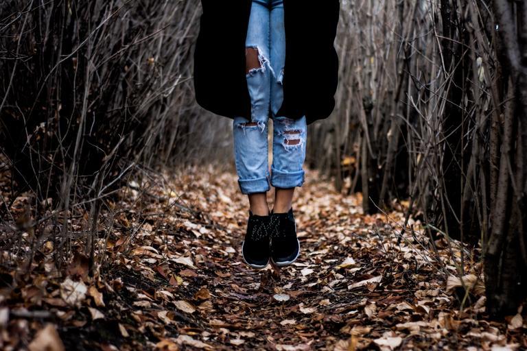 Keywords: levitation hanging path autumn swinging jeans torn female magic weightlessness mid-air outdoors lift off surreal imagination girl hang air gravity-free