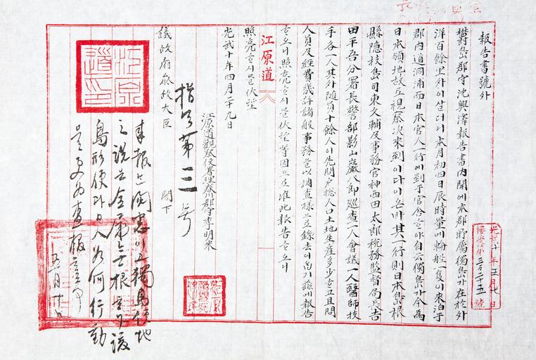 | Keywords: Liancourt Rocks Report by Yi Myeong-nae (1906-04-29) and Bak Je-sun's Directive No. 3 (1906-05-20).jpg en Extra Report by Yi Myeong-nae Governor of Gangwon Province April 29 1906 Directive No 3 by Bak Je-sun State Council Minister May 20 1906 ja 江原道観察使署理春 郡守 明 の号外報告書(1906年4 29日) 参政大臣 斉純の指令第3号(1906年5 20日) http //dokdo mofa go kr/upload/dokdo_truth pdf Ministry of Foreign Affairs ROK Governor of Gangwon Province Yi Myeong-nae 1906-04-29 PD-KoreaGov Letters concerning Liancourt Rocks PD-old-70-1923 |