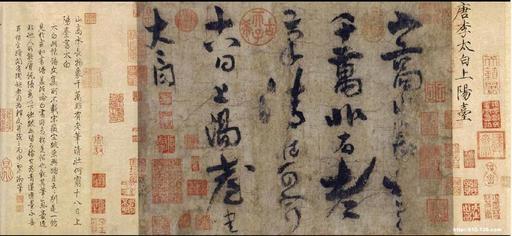 Keywords: Libai shangyangtai.jpg Artwork 上阳台帖 en Shàng yángtái tiě 上阳台帖 Going Up To Sun Terrace On the Balcony fr Shàng yángtái tiě 上阳台帖 carte calligraphiée « Sur le Balcon » zh 中国唐 诗人 白手书 迹 上阳台帖 ,现藏于北京故宫博物院 Tang Dynasty poet Li Bai the only surviving example of Li Bai's own calligraphy is now housed at the Palace Museum in Beijing China <small>http //www flashpointmag com/libai10 htm</small> Lǐ Bái 白 de la dynastie Tang C'est l'unique exemplaire d'un poème authentifié comme calligraphié par Li Bai il est conservé au Musée du palais de Pékin http //www w3d cn/allnews asp id 875 sortid1 5 sortid2 0 701 762 PD-old-100 Li Bai Calligraphy in the Palace Museum