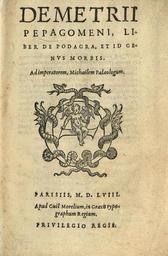 | Keywords: Liber De Podagra, Paris, Demetrios Pepagomenos, 1558.jpg  el Εξώφυλλο της λατινικής μετάφρασης του έργου Σύνταγμα  ερὶ τῆς  οδάγρας του Δημητρίου Πε αγωμένου Παρίσι 1558 en Title page of the greek to latin translation of Σύνταγμα  ερὶ τῆς  οδάγρας / Liber De Podagra of Demetrios Pepagomenos Paris 1558 1558 http //www onassislibrary gr/el/syllogi/antikeimena/37186_el/ Demetrios Pepagomenos author / Marcos Mousouros translator / Guillaume Morel publisher other versions Custom license marker 2016 12 30 PD-art PD-1923 Title pages in Latin Historical literature about gout |