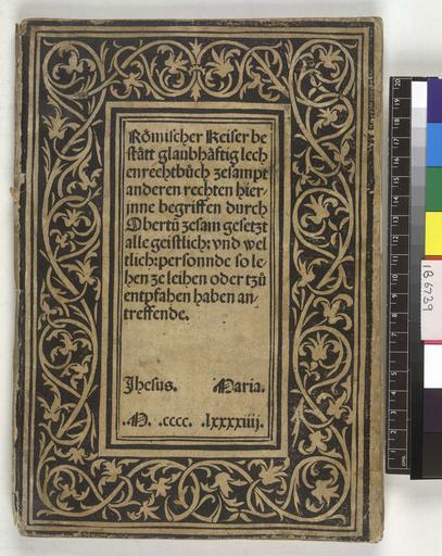 Keywords: Libri feudorum (with the Glossa ordinaria of Accursius)--German- Das b-uch des kaiserlichen Lehenrecht. - Upper cover (IB6739).jpg Style Panel design; Caption Upper cover; Colour White / cream; Edge Unspecified exhibition history Decorative Technique Woodblock printed; Cover Material Paper blocked Thick paper wrappers formed by pasting together 3 leaves of paper of normal thickness Both covers decorated with woodcuts with a border of white foliage on black ground object history Text 1493; Augsburg; Unspecified object type Cc-zero place of creation Binding Germany place of discovery See H M Nixon Broxbourne Library Styles London 1956 British Library image http //www bl uk/catalogues/bookbindings/LargeImage aspx RecordId 020-000007846 ImageId ImageId 43528 Copyright BL Libri feudorum with the Glossa ordinaria of Accursius German Das b uch des kaiserlichen Lehenrecht Uploaded with GWToolset Libri feudorum with the Glossa ordinaria of Accursius German Das b uch des kaiserlichen Lehenrecht - Upper cover IB6739 http //www webarchive org uk/bldatasets/bindings/8361_4 jpg Bookbinding 15th-century bookbinding British Library Bookbindings |