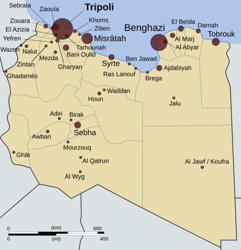 | Keywords: Libyan Uprising-fr.svg Carte représentant la guerre civile libyenne de 2011 au 20 octobre 2011 avec entre autres les villes de Tripoli Benghazi et Misrâtah <br /> La taille des cercles correspond à la population des villes Libyan uprising fr Libyan_Uprising svg Libyan_Uprising svg Rafy en Interchange88 Derivative work Pilkarz <span class signature-talk >talk</span> 00 34 6 March 2011 UTC 2011-03-06 Other versions/Libyan Uprising Traduction en français Simply Translated into French Pilkarz Libyan_Uprising svg Cc-zero Original upload log This image is a derivative work of the following images File Libyan_Uprising svg licensed with Cc-zero 2011-03-02T22 29 03Z Rafy 339x354 38414 Bytes <nowiki>oops</nowiki> 2011-03-02T22 11 41Z Rafy 339x354 35936 Bytes <nowiki>uploaded wrong one</nowiki> 2011-03-02T22 10 02Z Rafy 339x354 35936 Bytes <nowiki>More accurate city scales Updates </nowiki> 2011-03-02T20 57 26Z Magog the Ogre 339x354 36812 Bytes <nowiki> Brega Adjabiya and Bani Walid per the talk page</nowiki> 2011-03-02T11 12 39Z Rafy 339x354 35936 Bytes <nowiki>Colour tweaks Gharyan Sebrata Brega and Ajdabia under attack</nowiki> 2011-03-02T10 32 38Z Transparent 6lue 339x354 32868 Bytes <nowiki>Reverted to version as of 19 39 1 March 2011 it's called Tripoli </nowiki> 2011-03-02T10 18 48Z Giornorosso 339x354 32861 Bytes <nowiki>Ajdabiya contested</nowiki> 2011-03-02T10 17 00Z Giornorosso 339x354 32861 Bytes <nowiki>Gharyan captured by Ghaddafi</nowiki> 2011-03-01T19 39 14Z U5K0 339x354 32868 Bytes <nowiki>misrata in rebbel hands still </nowiki> 2011-03-01T19 28 17Z U5K0 339x354 32810 Bytes <nowiki>zawiya in rebel hands after repelling attacks</nowiki> 2011-03-01T12 21 03Z Rafy 339x354 32406 Bytes <nowiki>Black border makes light green more visible over a grey background </nowiki> 2011-03-01T12 04 56Z Rafy 339x354 31875 Bytes <nowiki>corrected position of khums and zliten added a better green as per discussion added grey border do distinguish overlapping cities aziziya and tripoli for example </nowiki> 2011-03-01T07 38 13Z Magog the Ogre 339x354 34210 Bytes <nowiki> kill red border per complaint on talk page</nowiki> 2011-03-01T03 51 03Z Rafy 339x354 33791 Bytes <nowiki>colours improve scales based on http //www world-gazetteer com/wg php x 1298950805 men glay lng en des gamelan geo -133 srt dpnn col abcdefghimoq msz 1500 this source</nowiki> 2011-03-01T03 20 06Z JasonAQuest 339x354 27052 Bytes <nowiki>restore city sizes</nowiki> 2011-03-01T02 26 10Z Rafy 339x354 31644 Bytes <nowiki>Tripoli to green and and Misrata and Zawia to yellow</nowiki> 2011-03-01T02 16 10Z Rafy 339x354 32189 Bytes <nowiki>Colourblind friendly updated situation Ghadamis and Bani Walid were never under opposition control </nowiki> 2011-02-28T20 46 05Z Gryffindor 339x354 28395 Bytes <nowiki>the large dots make reading the city names difficult also some are too small</nowiki> 2011-02-28T19 30 49Z Interchange88 339x354 27375 Bytes <nowiki>Reverted to version as of 03 36 28 February 2011 drive-by edit no reasons no discussion</nowiki> 2011-02-28T15 13 46Z Gryffindor 339x354 28395 Bytes <nowiki>Reverted to version as of 20 15 27 February 2011</nowiki> 2011-02-28T03 36 14Z JasonAQuest 339x354 27375 Bytes <nowiki>scale cities according to size</nowiki> 2011-02-27T20 15 42Z JasonAQuest 339x354 28395 Bytes <nowiki>neutral background</nowiki> 2011-02-27T17 36 21Z Rafy 339x354 54770 Bytes <nowiki>Using one colour for the map as per discussion</nowiki> 2011-02-27T17 06 02Z Rafy 339x354 54768 Bytes <nowiki>Colour tweaks Al Aziziya still controlled by Gaddafi </nowiki> 2011-02-27T14 48 05Z U5K0 338x354 57558 Bytes <nowiki>Al Zawiya liberated as per BBC Al Jazeera see article talk page </nowiki> 2011-02-27T14 22 17Z Rafy 338x354 56608 Bytes <nowiki>Bigger bullets</nowiki> 2011-02-27T11 00 26Z Rafy 387x354 58251 Bytes <nowiki>tweaks</nowiki> 2011-02-27T01 56 45Z Rafy 387x354 66921 Bytes <nowiki>corrections</nowiki> 2011-02-27T01 50 06Z Rafy 387x354 133950 Bytes <nowiki>saved as plain</nowiki> 2011-02-27T01 47 44Z Rafy 387x354 154560 Bytes <nowiki> en Situation as of 26/2/2011 own Rafy 2011-02-27 Libyan uprising</nowiki> Uploaded with derivativeFX Maps of the 2011 Libyan civil war |