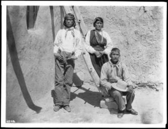 Keywords: Lieutenant Governor Miller with his wife and brother at the Acoma Pueblo, New Mexico, 1886 (CHS-4546).jpg en <br> Lieutenant Governor Miller with his wife and brother at the Acoma Pueblo New Mexico 1886 Photograph of Lieutentant Governor Miller with his wife and brother at the Acoma Pueblo New Mexico 1886 They are grouped about an exterior ladder which leans against the adobe wall of a building at left providing access to upper levels of the pueblo One man wearing a cloth wrapped about his head a long-sleeved shirt trousers and suspenders stands leaning against the ladder The second man is sitting at the base of the ladder and wears a long-sleeved shirt pants and a bandana around his neck He holds a hat in his hand Governor Miller's wife reclines against the ladder She wears a dress long-sleeved shirt and necklaces Call number CHS-4546 Photographer James George Wharton Filename CHS-4546 Coverage date 1886 Part of collection California Historical Society Collection 1860-1960 Type images Geographic subject city or populated place Acoma Pueblo Repository name USC Libraries Special Collections Accession number 4546 Microfiche number 1-160-59 Archival file chs_Volume96/CHS-4546 tiff Part of subcollection Title Insurance and Trust and C C Pierce Photography Collection 1860-1960 Repository address Doheny Memorial Library Los Angeles CA 90089-0189 Geographic subject country USA Format aacr2 2 photographs transparency photoprint b w ; 20 x 25 cm 17 x 22 cm Rights Digitally reproduced by the USC Digital Library; From the California Historical Society Collection at the University of Southern California Subject adlf tribal areas Project USC Repository email specol usc edu Identifying number unidentified no James-1375 Contributing entity California Historical Society Date created 1886 Publisher of the digital version University of Southern California Libraries Format aat transparencies; photographic prints; photographs Geographic subject state New Mexico Legacy record ID chs-m16881; USC-1-1-1-13461 Access conditions Send requests to address or e-mail given Phone 213 821-2366; fax 213 740-2343 Subject file heading Indians -- Acoma Subject lcsh Indians of North America; Acoma Indians Subject Acoma Indians; Miller Lieutentant Governor; Acoma; Acoma Indians 1886 date created George Wharton James 1858 1923 http //digitallibrary usc edu/cdm/ref/collection/p15799coll65/id/16803 PD-old-70-1923 Images from USC Digital Library uploaded by Fæ Photographs by George Wharton James California Historical Society Collection 1860-1960 Acoma Pueblo |