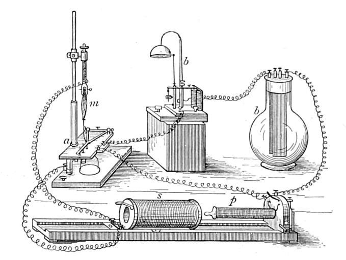 | Keywords: Life in Motion Fig 11.png en Fig 11 ”Arrangement of apparatus for showing muscle lifting a weight b galvanic element; b in middle electric bell; p primary and s secondary coil of induction machine; a frog interrupter; m muscle See next figure Life in Motion or Muscle and Nervehttps //archive org/details/b21929786 John Gray McKendrick 1892 1926 Life in Motion book Galvanism |