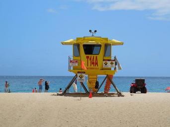 Keywords: lifeguard tower beach safety yellow ocean rescue sandy beach sea people sky clouds hawaii maui big makena beach