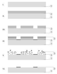 Keywords: Lift-off (microtechnology) process.svg The image illustrates the Lift-off process used in microfabrication mostly to create metallic interconnects I Preparation of the substrate II Deposition of the sacrificial stencil layer III Patterning the sacrificial layer ex etching creating an inverse pattern IV Depostion of the target material V Washing out the sacrificial layer together with the target material on its surface VI Final pattern 1 Substrate 2 Sacrificial layer 3 Target material Own 07 04 2008 Twisp Semiconductor devices fabrication SVG microtechnology |