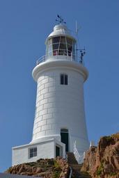 Keywords: lighthouse white blue sky rock close-up concrete block tower la corbière jersey channel islands