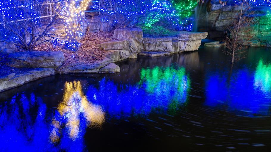 Keywords: lights reflection water decoration holiday urban colorful bright landscape outdoors garden bushes trees