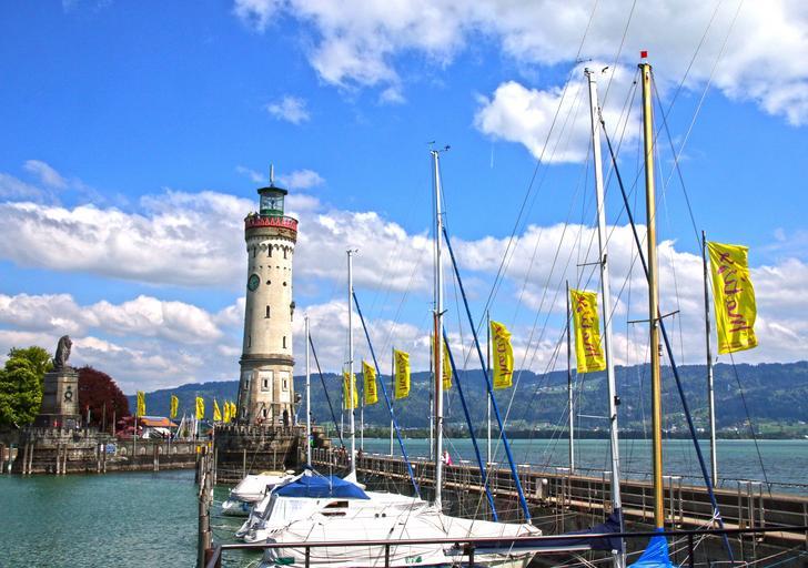 Keywords: lindau lake constance port lighthouse boats sailing boats flags sky blue clouds