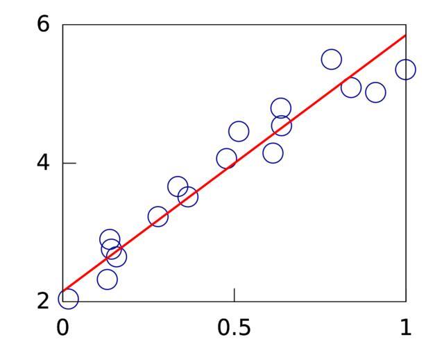 | Keywords: Linear-regression.svg en An example of linear regression Own Qef 2009-06-21 Designed to replace original bitmap version en File Linear-regression png Qef Gnuplot source Created with the following Gnuplot file <pre> set terminal svg font Bitstream Vera Sans 24 set output Linear-regression svg set xrange 0 1 set yrange 2 6 set xzeroaxis linetype -1 set yzeroaxis linetype -1 set xtics border nomirror 0 5 set ytics border nomirror 2 set key off set border 15 set samples 2 duh straight line plot '-' with points pointtype 6 pointsize 1 5 linecolor 6 0 84018771715471 5 0920721752254 0 78309922375861 5 4993770054934 0 91164735793678 5 0219594480046 0 33522275571489 3 663139781769 0 27777471080319 3 2292176040979 0 47739705186216 4 0677809238643 0 36478447279184 3 5137723092023 0 95222972517471 6 3816035819077 0 6357117279599 4 7956233221396 0 1416025553558 2 7597376235082 0 01630057162433 2 0398219692681 0 13723157678602 2 9002851883054 0 15667908925408 2 6485946288034 0 12979044678146 2 3215484331961 0 99892451800356 5 3518979261186 0 5129323944044 4 4596524827421 0 61263983259566 4 1465031113153 0 63755226770302 4 5417962600388 e plot 3 7 x+2 15 with lines linewidth 3 linecolor 1 </pre> The actual data is just randomly choosen points along the line randomly displaced from it created with a small Lua program <pre> function f x return 3 7 x + 2 15 end for _ 1 18 do local x math random print x f x 0 85 + 0 3 math random end </pre> Linear regression Images with Gnuplot source code |