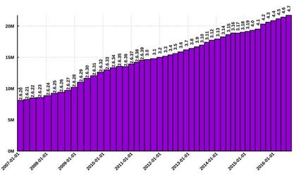 Keywords: Lines of Code Linux Kernel.svg Linux-Kernel Linux-kernel 2015-07-13 own StefanPohl other versions de Vorlage LinuxKernelMLOC v get_dt i i 0 1 i 1 '-' i 2 ' ' '_' do fori 0 3 set style line 1+10 i lt 1 dt get_dt i lw 1 lc rgb ' ff3333' set style line 2+10 i lt 1 dt get_dt i lw 1 lc rgb ' 00ccff' set style line 3+10 i lt 1 dt get_dt i lw 1 lc rgb ' 66ff33' set style line 4+10 i lt 1 dt get_dt i lw 1 lc rgb ' cccccc' set style line 5+10 i lt 1 dt get_dt i lw 1 lc rgb ' 009999' set style line 6+10 i lt 1 dt get_dt i lw 1 lc rgb ' ff9933' set style line 7+10 i lt 1 dt get_dt i lw 1 lc rgb ' 000000' set style line 8+10 i lt 1 dt get_dt i lw 1 lc rgb ' 336600' set style line 9+10 i lt 1 dt get_dt i lw 1 lc rgb ' 9900cc' set style line 10+10 i lt 1 dt get_dt i lw 1 lc rgb ' cc9999' set grid lc rgb ' AAAAAA' lt 2 dt ' ' lw 75 set border 3 set tics nomirror scale 5 set autoscale fix unset key set xtics rotate by 45 right set term svg size 1000 600 lw 2 fname 'Arial bold' fsize 15 set output 'kernel svg' set size 1 95 set datafile separator ' ' set boxwidth 1 relative set style fill solid border -1 fmt ' Y- m- d' set timefmt fmt set format x fmt set xdata time set xtics scale 0 set yrange 0 set format y ' sx10 T' set format y ' sM' plot 'kernel txt' u 3 2 w boxes \ u 3 2 1 w labels rotate by 90 offset 0 1 unset output <pre> kernel txt version loc date days of development 2 6 20 8102486 2007-02-04 66 2 6 21 8246470 2007-04-26 80 2 6 22 8499363 2007-07-08 74 2 6 23 8566554 2007-10-09 93 2 6 24 8859629 2008-01-24 107 2 6 25 9232484 2008-04-17 83 2 6 26 9411724 2008-07-13 88 2 6 27 9709868 2008-10-09 88 2 6 28 10195507 2008-12-24 76 2 6 29 11010647 2009-03-23 89 2 6 30 11637173 2009-06-10 78 2 6 31 12046317 2009-09-09 92 2 6 32 12610030 2009-12-03 84 2 6 33 12990041 2010-02-24 83 2 6 34 13320934 2010-05-16 82 2 6 35 13545604 2010-08-01 77 2 6 36 13499457 2010-10-20 80 2 6 37 13916632 2011-01-05 76 2 6 38 14208866 2011-03-15 69 2 6 39 14533582 2011-05-19 65 3 0 14646952 2011-07-22 64 3 1 14770469 2011-10-24 94 3 2 14998651 2012-01-04 73 3 3 15166074 2012-03-18 74 3 4 15383860 2012-05-20 63 3 5 15596378 2012-07-21 62 3 6 15868036 2012-09-30 71 3 7 16191690 2012-12-11 71 3 8 16416874 2013-02-18 70 3 9 16686879 2013-04-29 69 3 10 16955489 2013-06-30 63 3 11 17403279 2013-09-02 63 3 12 17726872 2013-11-03 62 3 13 17930916 2014-01-20 77 3 14 18271989 2014-03-31 70 3 15 18632574 2014-06-08 53 3 16 18879129 2014-08-03 56 3 17 18864388 2014-10-05 63 3 18 18994096 2014-12-07 64 3 19 19130604 2015-02-09 63 4 0 19312370 2015-04-12 63 4 1 19512485 2015-06-22 63 4 2 20311717 2015-08-30 70 4 3 20621444 2015-11-01 63 4 4 20862115 2016-01-10 70 4 5 21154545 2016-03-14 63 4 6 21422694 2016-05-15 63 4 7 21712846 2016-07-24 70 4 8 22071048 2016-10-02 70 </pre> cc-zero Linux kernel development