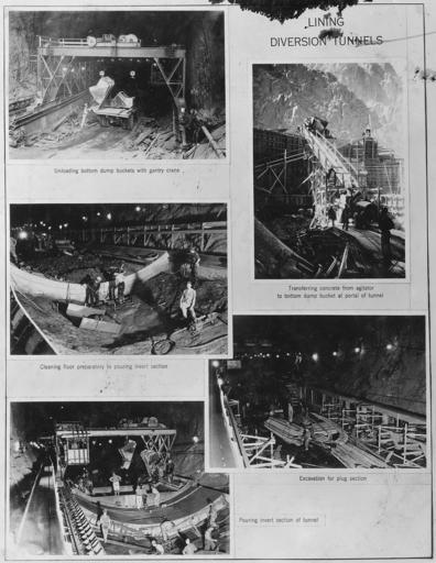 | Keywords: Lining Diversion Tunnels - NARA - 293869.jpg Scope and content Photograph from Volume Two of a series of photo albums documenting the construction of Hoover Dam Boulder City Nevada General notes This is a compilation of 5 photographs It bears an ink stain in the upper center of the panel 293869 Local identifier Department of the Interior Bureau of Reclamation Engineering and Research Center 05/18/1981 - 03/04/1988 NARA's Rocky Mountain Region Denver NRGA Building 48 Denver Federal Center West 6th Avenue and Kipling Street Denver CO 80225-0307 1932 Record group Record Group 115 Records of the Bureau of Reclamation 1889 - 2008 Record group ARC 444 Photograph albums compiled 1903 - 1972 Series ARC 293611 File unit File unit ARC Variant control numbers NAIL Control Number NRG-115-CONSTPHO85006-BC21738 Other versions <gallery> File Lining Diversion Tunnels - NARA - 293869 tiff tif File Lining Diversion Tunnels - NARA - 293869 jpg jpg </gallery> NARA-cooperation PD-USGov Construction of the Hoover Dam |