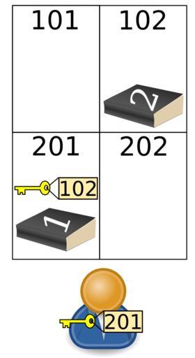 Keywords: Linked list post office box analogy.svg en The post office box analogy for a linked list Suppose Alice is a spy who wishes to give a codebook to Bob by putting it in a post office box and then giving him the key However the book is too thick to fit in a single post office box so instead she divides the book into two halves and purchases two post office boxes In the first box box 201 she puts the first half of the book and a key to the second box and in the second box box 102 she puts the second half of the book She then gives Bob bottom a key to the first box Derived from public domain works File Paperback book black gal svg File Public key shared secret svg File Emblem-person-blue svg 2011-06-14 own Dcoetzee Linked list post office box analogy 1 svg Linked list post office box analogy 2 svg Linked list post office box analogy 3 svg cc-zero Uploaded with UploadWizard Linked lists |