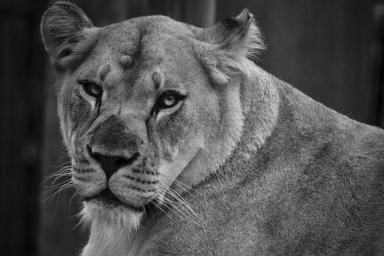 Keywords: lioness female lion close up staring wildlife feline mammal carnivore nature predator resting portrait black and white looking