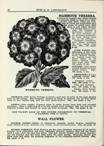 Keywords: Lippincott seeds (15750802824).jpg 46 <br> MISS C H LIPPINCOTT <br> MAMMOTH VERBENA <br> MAMMOTH VERBENA <br> Flowers of unusual size single flowers <br> sometimes being as large as a twen- <br> flye cent piece while the clus- <br> ters of bloom are magniflcent and <br> range of colors more yirld <br> than in any other mixture <br> For garden beds or mas- <br> sing the Verbena is <br> unrivaled ; flowers of <br> the most brilliant col- <br> or blooming continual- <br> ly from spring until <br> late in the autumn <br> Although perennials <br> they bloom profusely <br> the first season from <br> seed Pkt 100 seeds <br> f cts <br> PURE WHITE Can- <br> didissima A fine strain <br> of large flowering pure <br> white Hybrid Verben <br> as ; trusses large and <br> borne freely at all <br> times ; always comes <br> true from seed Pkt <br> 100 seeds 5 cts <br> STRIPED Very showy <br> striped flowers of many <br> bright colors Pkt <br> 100 seeds 5 cts <br> DEFIANCE True <br> brightest scarlet Pkt <br> 100 seeds 5 cts <br> Primrose yellow <br> Pkt 100 seeds 6 cts <br> Pink and Carmine <br> Pkt 100 seeds 6 cts <br> Purple Dark Purple <br> Pkt 100 seeds 6 cts <br> ODORATA This lovely Verbena is hardy; seed may be sown in the open gronnd <br> early in the spring The blossoms instead of being in clusters run np into spikes <br> three or four inches long and are very sweet-scented Pkt 100 seeds 6 cts <br> L EMON This elegant fragrant plant Is easily grown from seed and succeeds <br> anywhere Have a good bed of it in the garden every summer that you can cut its <br> fragrant foliage and flowers to make np with bouquets Pkt 100 seeds 6 cts <br> ONE PACKET EACH OF THE ENTIRE COL I ECTION OF VERBENAS <br> 9 PACKETS FOR 35 CENTS <br> WALL FLOWER <br> DOUBLE MIXED Spikes of deliclously fragrant double flowers combining <br> many shades of color chocolate and orange purple predominating Pkt 60 seeds 6c <br> SINOL E PARISIAN Wall Flowers are the most delicately fragrant of all garden <br> flowers; th ir cultivation has been restricted however because they did not bloom <br> until a year after the seed was sown The new annual variety will flower through- <br> oat the summer and fall from seed sown the same spring Everyone should now <br> grow some and enjoy the pleasing fragrance of the cinnamon-colored flowers Pkt <br> 100 seeds 4 cts 42162016 132824 65968 Page 46 Text http //www biodiversitylibrary org/page/42162016 1915 Henry G Gilbert Nursery and Seed Trade Catalog Collection ; Miss C H Lippincott Firm NameFound Verbena NameConfirmed Verbena subser Pseudoracemosae N O'Leary EOLID 24001436 Biodiversity Heritage Library Lippincott seeds 1915 Garden Stories Catalogs Flowers Fruit Nurseries Horticulture Seeds Vegetables U S Department of Agriculture National Agricultural Library bhl page 42162016 dc identifier http //biodiversitylibrary org/page/42162016 bhlGardenStories BHLinbloom nurseries horticulture u s department of agriculture national agricultural library bhlgardenstories bhlinbloom Information field Flickr posted date ISOdate 2015-01-26 Check categories 2015 August 25 CC-BY-2 0 BioDivLibrary https //flickr com/photos/61021753 N02/15750802824 2015-08-25 05 55 30 cc-by-2 0 PD-old-70-1923 Lippincott seeds Photos uploaded from Flickr by FĂŚ using a script |